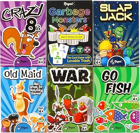 Fun-Filled Decks: Embrace the fun with six different games in one set! The set, designed for 2-6 players, contains decks for Old Maid, Go Fish, Slap Jack, Crazy 8’s, War, and Silly Monster Memory Match, providing hours of entertainment and learning opportunities.